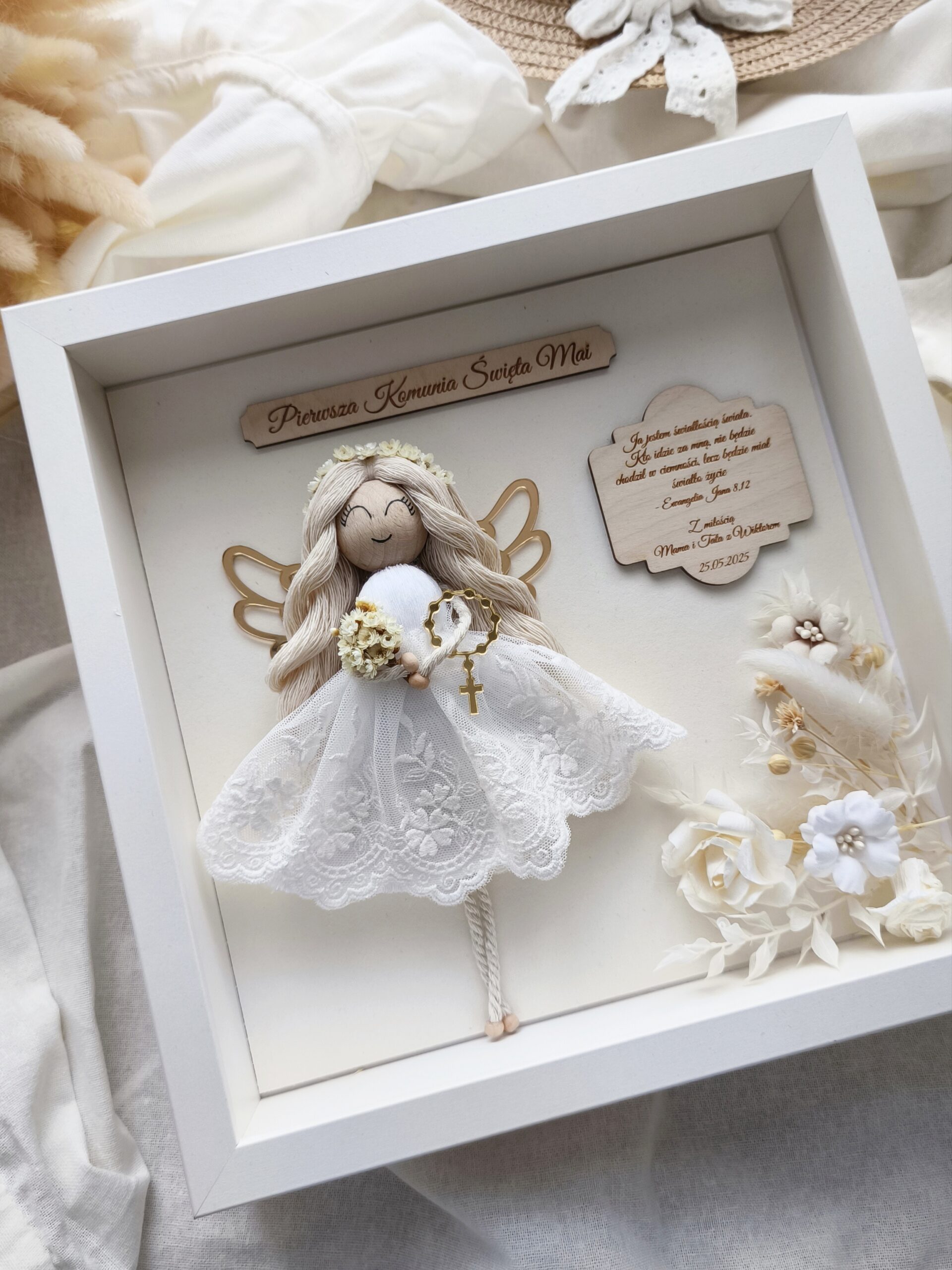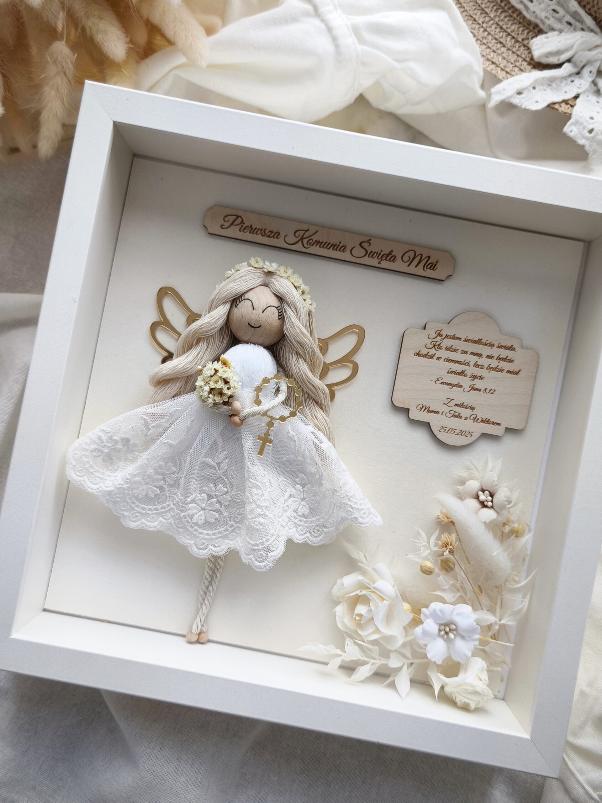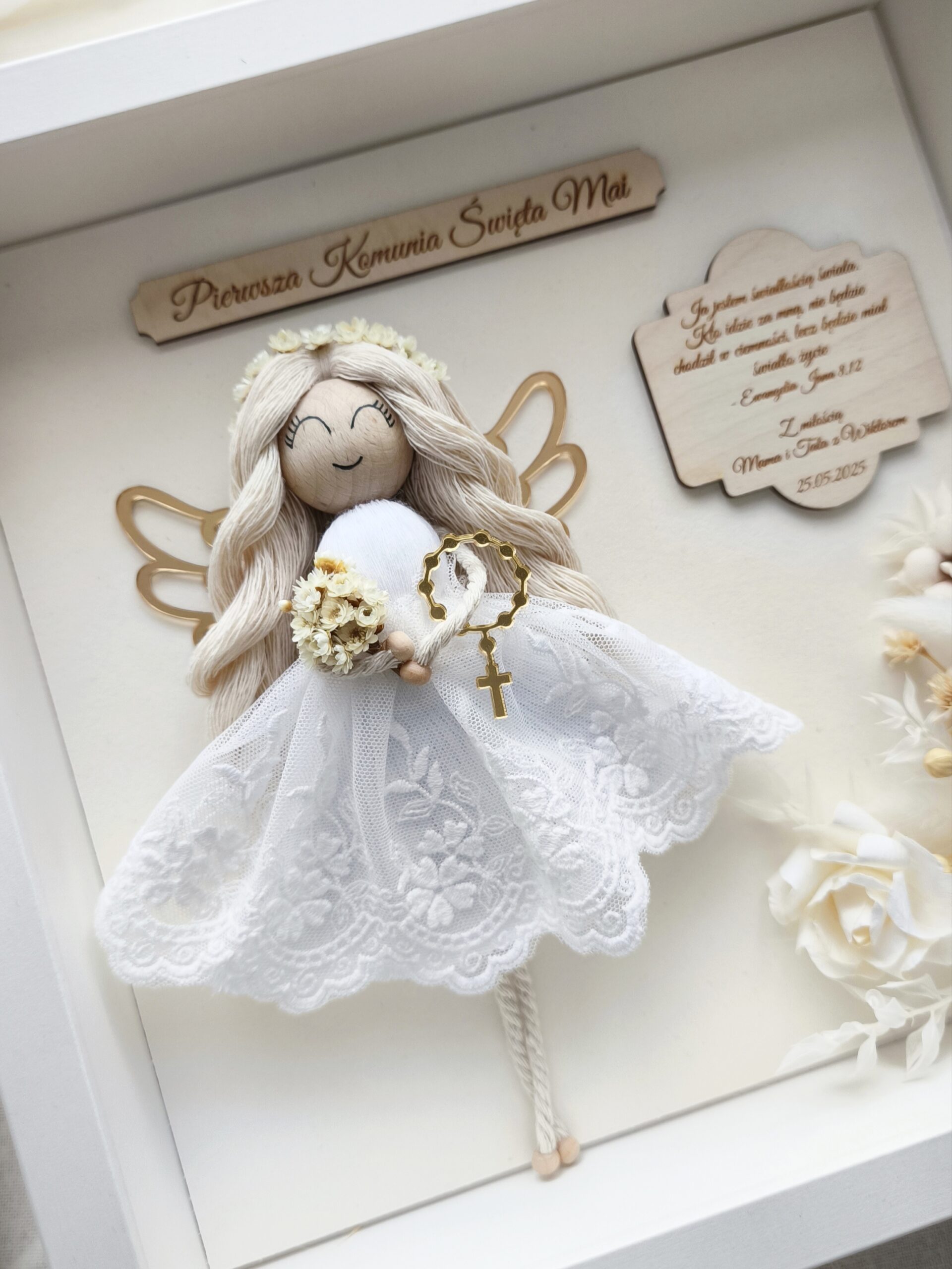 >Laleczka na główce ma wianuszek z suszonych kwiatów, w ręku zaś bukiecik oraz złoty różaniec, a w uszkach ma perłowe, maleńkie kolczyki. Złote, ażurowe skrzydła oraz zdobienie z naturalnych roślin, papierowych i bawełnianych kwiatów to idealne wykończenie pracy.  Sukienka została uszyta ręcznie z białego tiulu z koronką, który dodaje Aniołkowi elegancji i romantyzmu. Ramka utrzymana jest w naturalnych kolorach, dzięki czemu doskonale wpisze się w każde wnętrze.