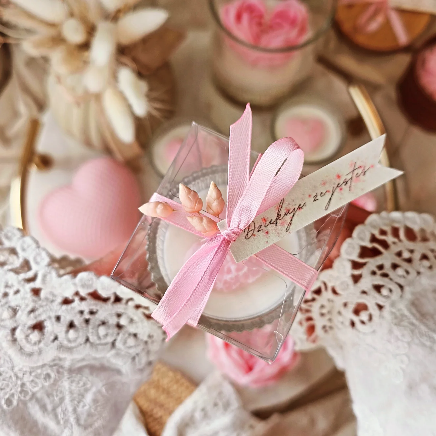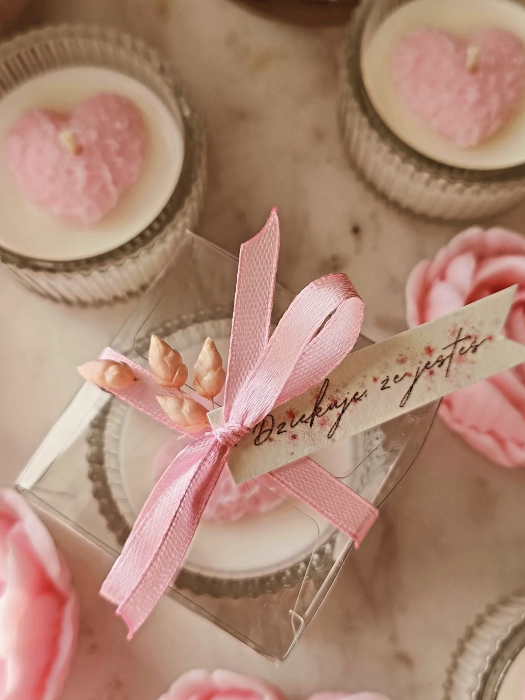 Świeca w szklanym naczyniu w przeźroczystym opakowaniu z kokardką od angelsbyanita będzie idealnym prezentem z okazji urodzin, imienin, Dnia Babci, Dnia Kobiet, Walentynek, ale również jako forma podziękowań dla gości za przybycie na naszą wyjątkową uroczystość taką jak np. Chrzest Święty, Komunia Święta czy Ślub.