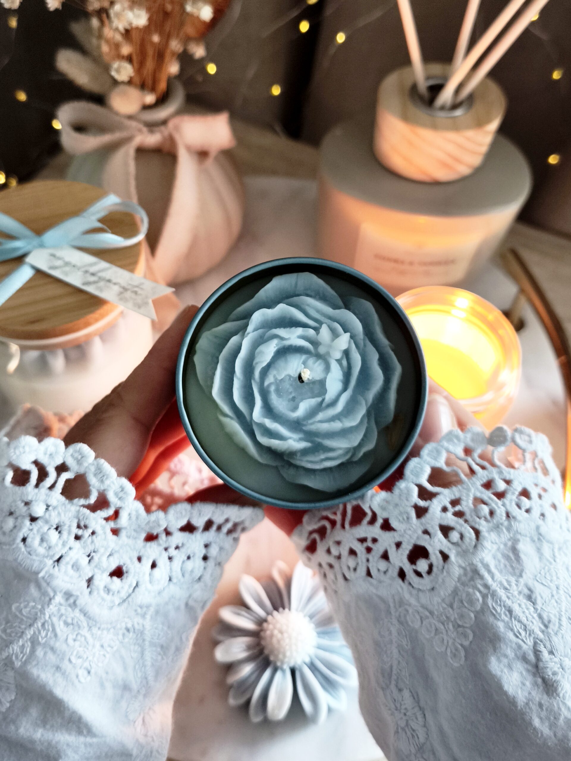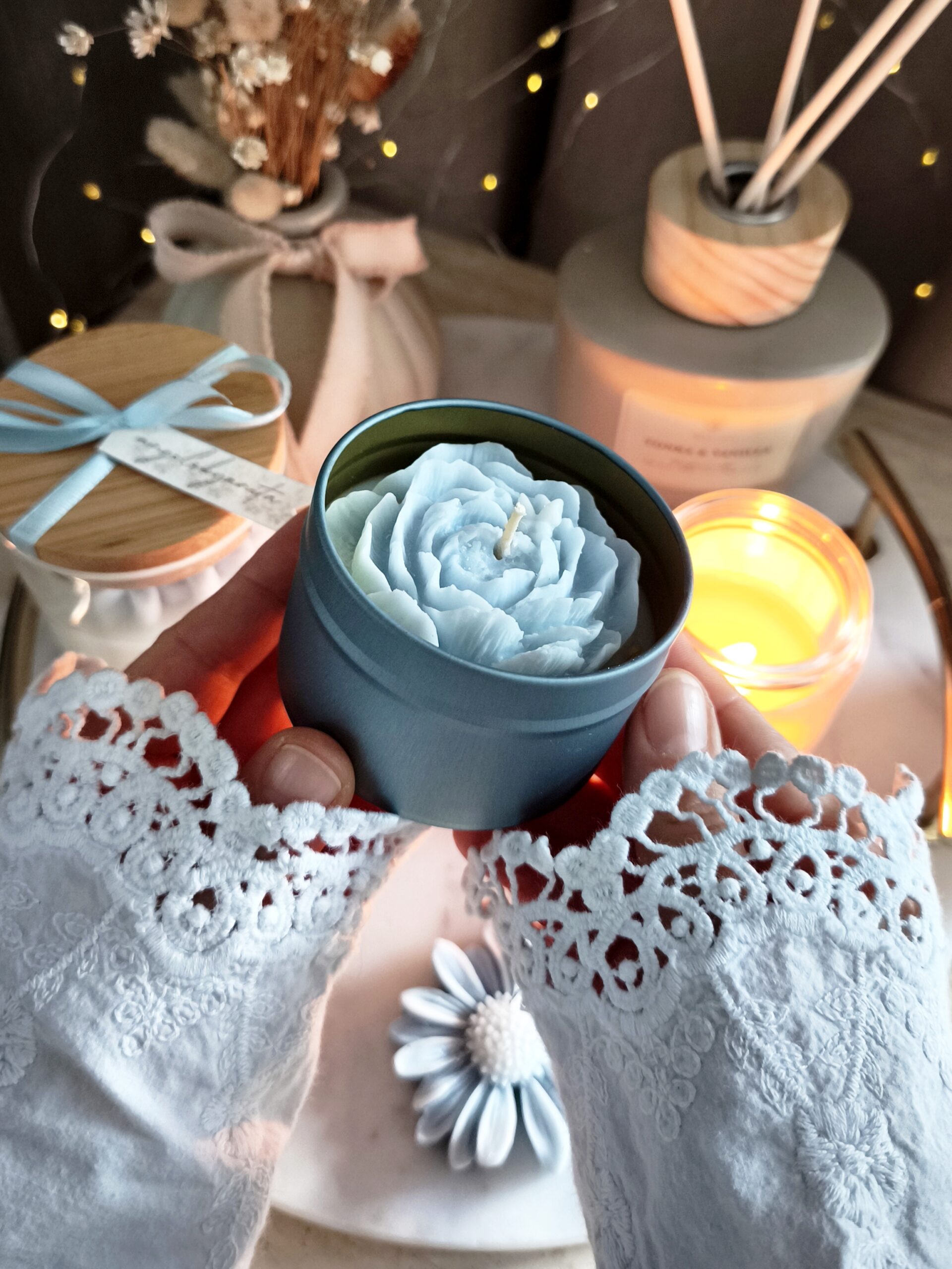 Ręcznie wykonana świeca sojowa, która zachwyca nie tylko zapachem, ale przede wszystkim swoim niepowtarzalnym wyglądem. W eleganckiej, satynowej, metalowej puszce skrywa się cudownej urody niebieska piwonia, która nadaje świecy wyjątkowego, nostalgicznego charakteru. To nie tylko źródło przyjemnego światła, ale również stylowy element dekoracyjny wnętrza.